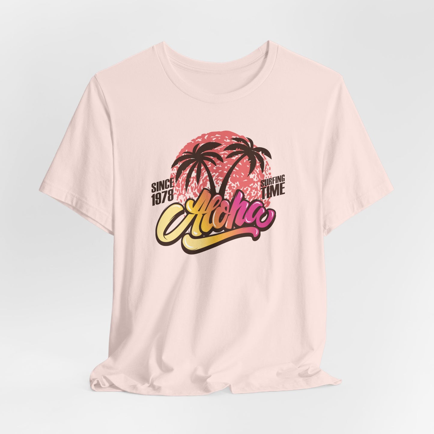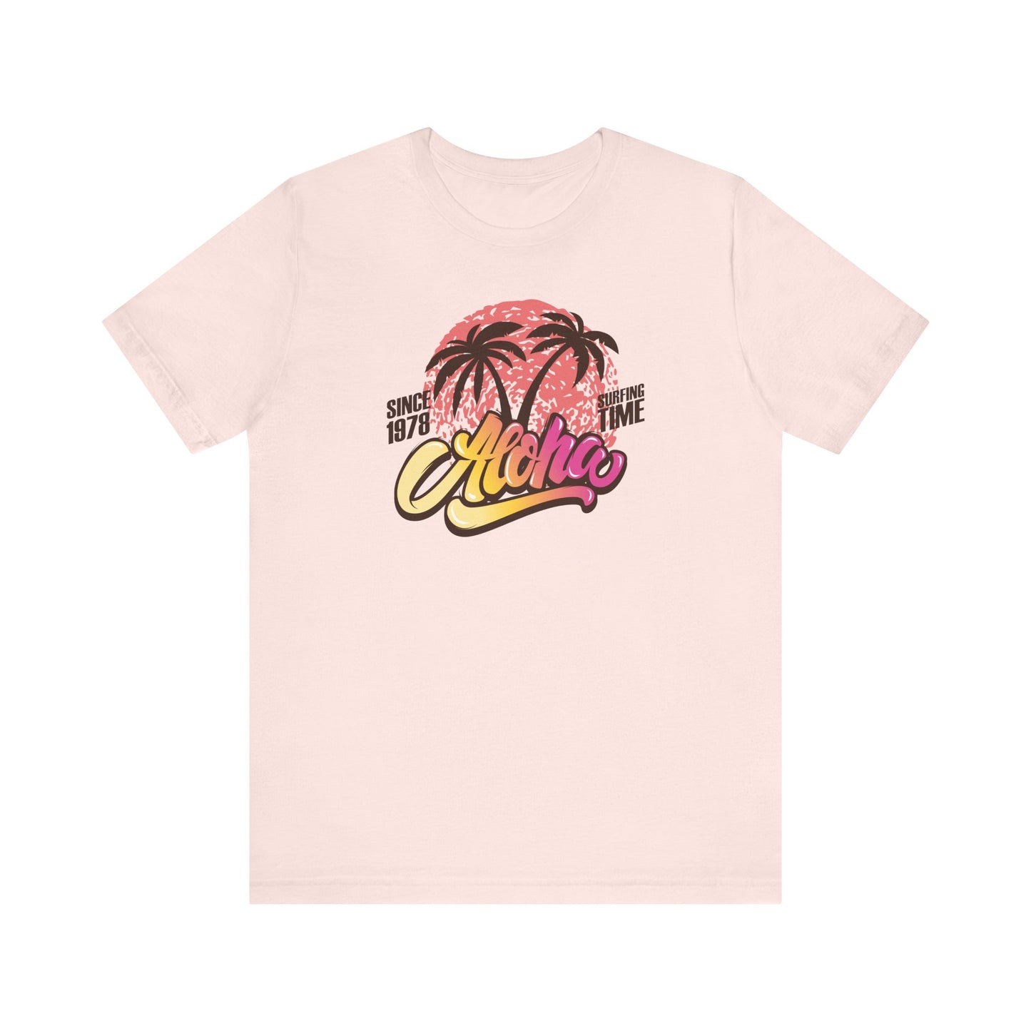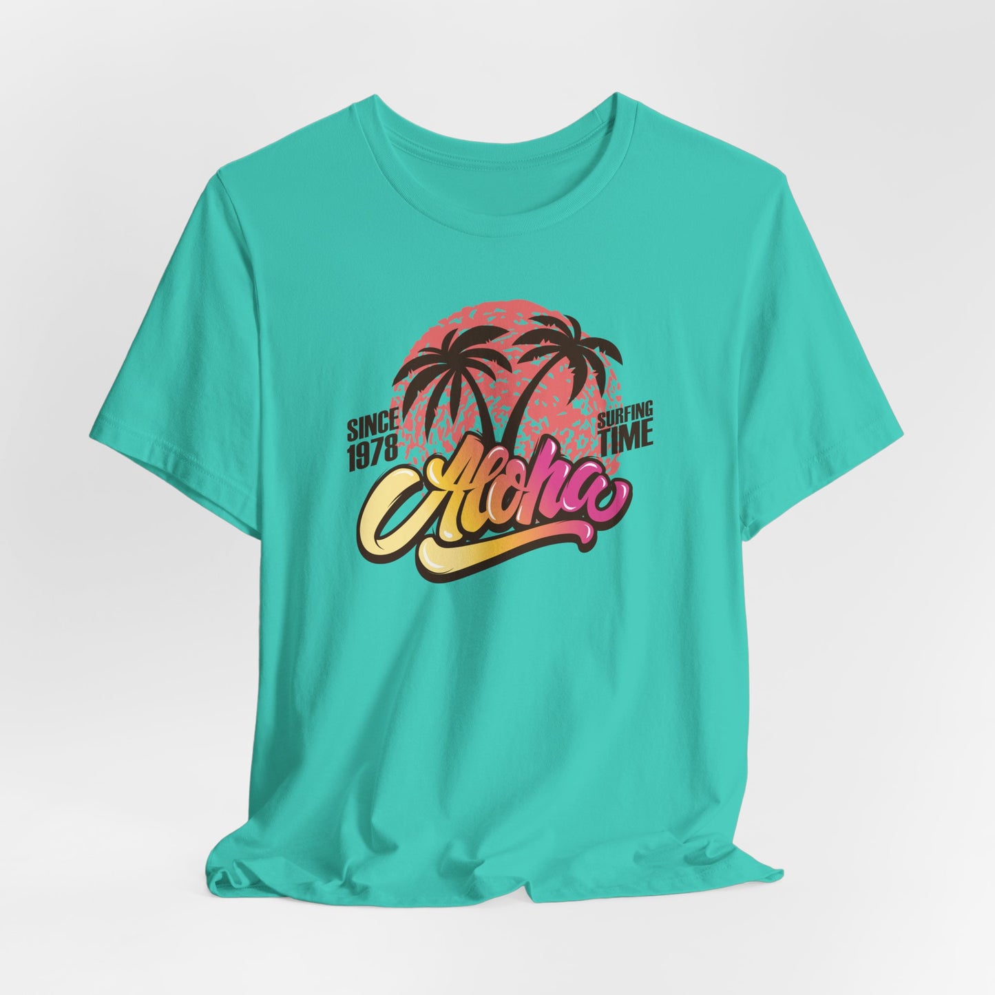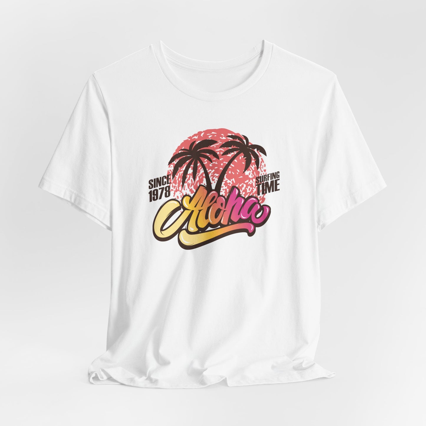 🌅🌴 Aloha — Vibrant Vibes! Celebrate timeless surf culture with this eye-catching design featuring "Aloha" in a funky font that transitions beautifully from golden orange to fuchsia, set over a bold coral red sun. The silhouette of two palm trees adds that perfect tropical touch, while the phrase "Since 1976 Surfing Time" pays tribute to classic beach vibes and endless summer adventures. Perfect for surf lovers and island dreamers ready to Express Yourself with color and style. Part of our Must-Have Merch collection at teeriffic.store, this design brings the spirit of surfing and sunshine wherever you go! 🌴🌞🌊✨