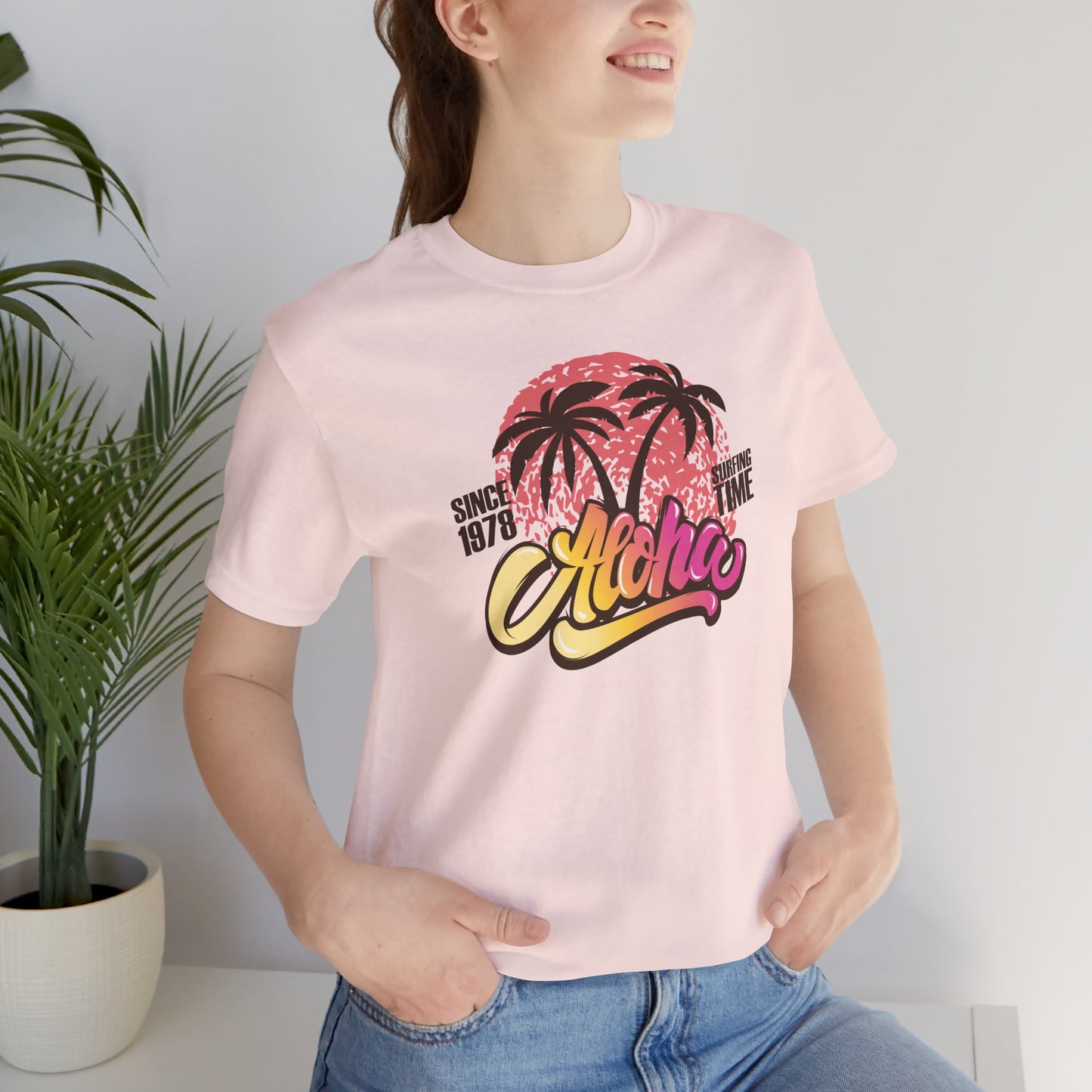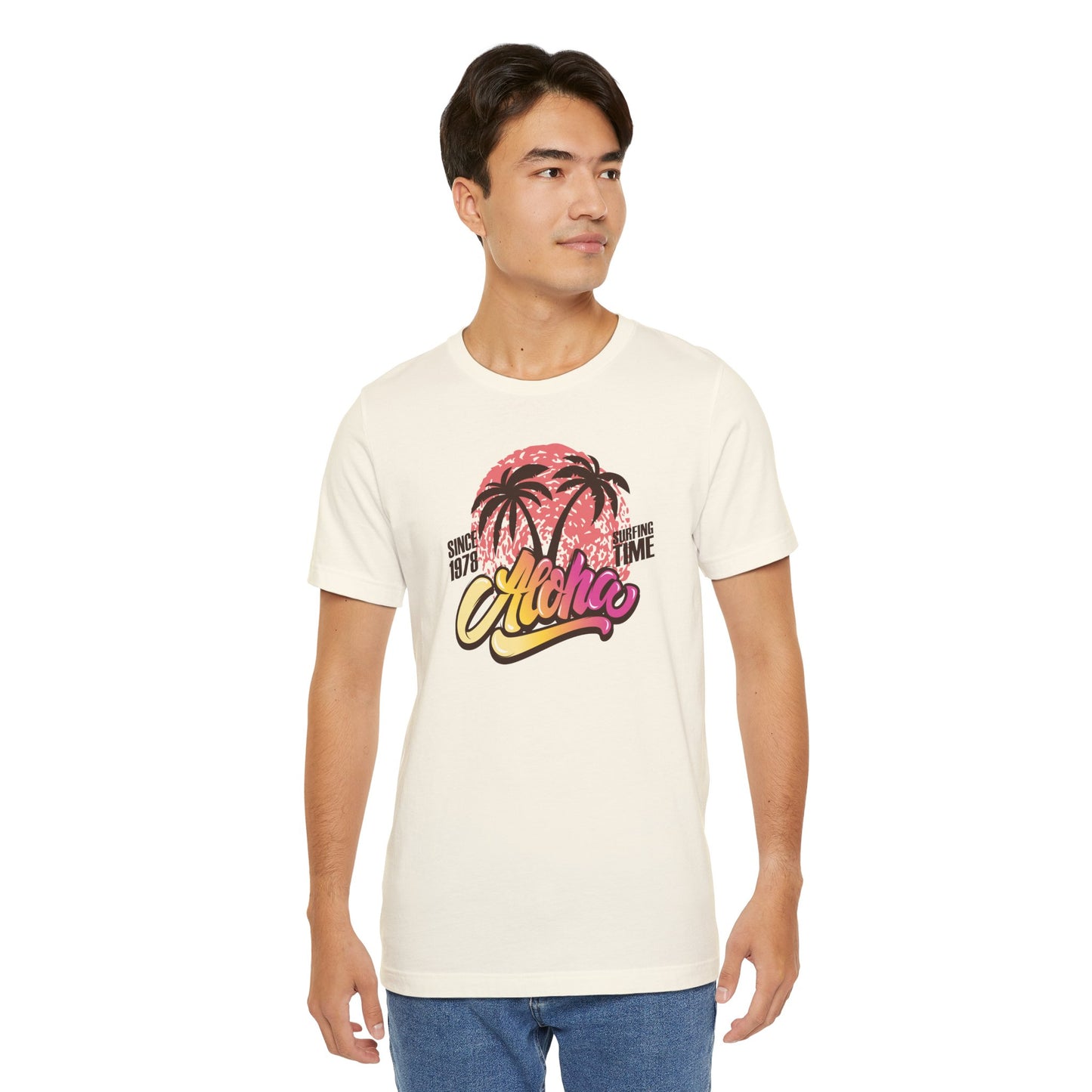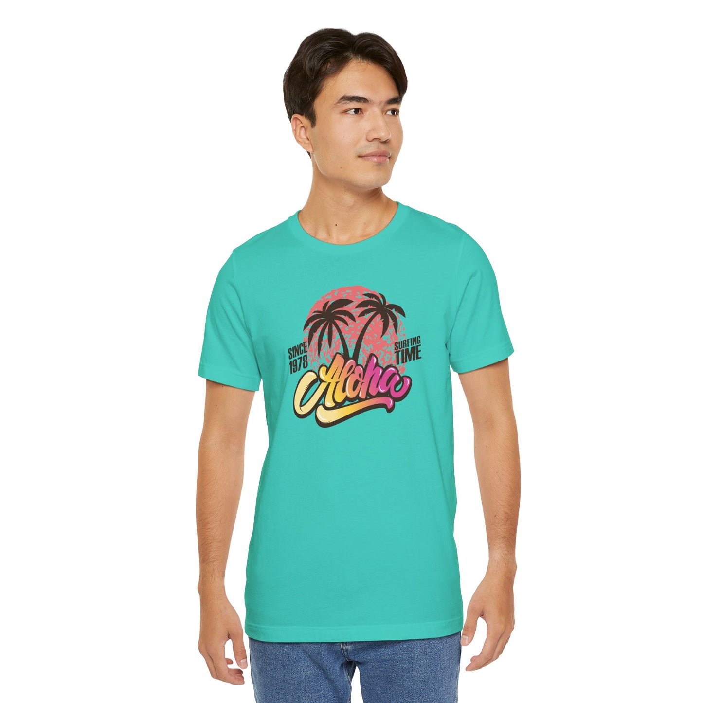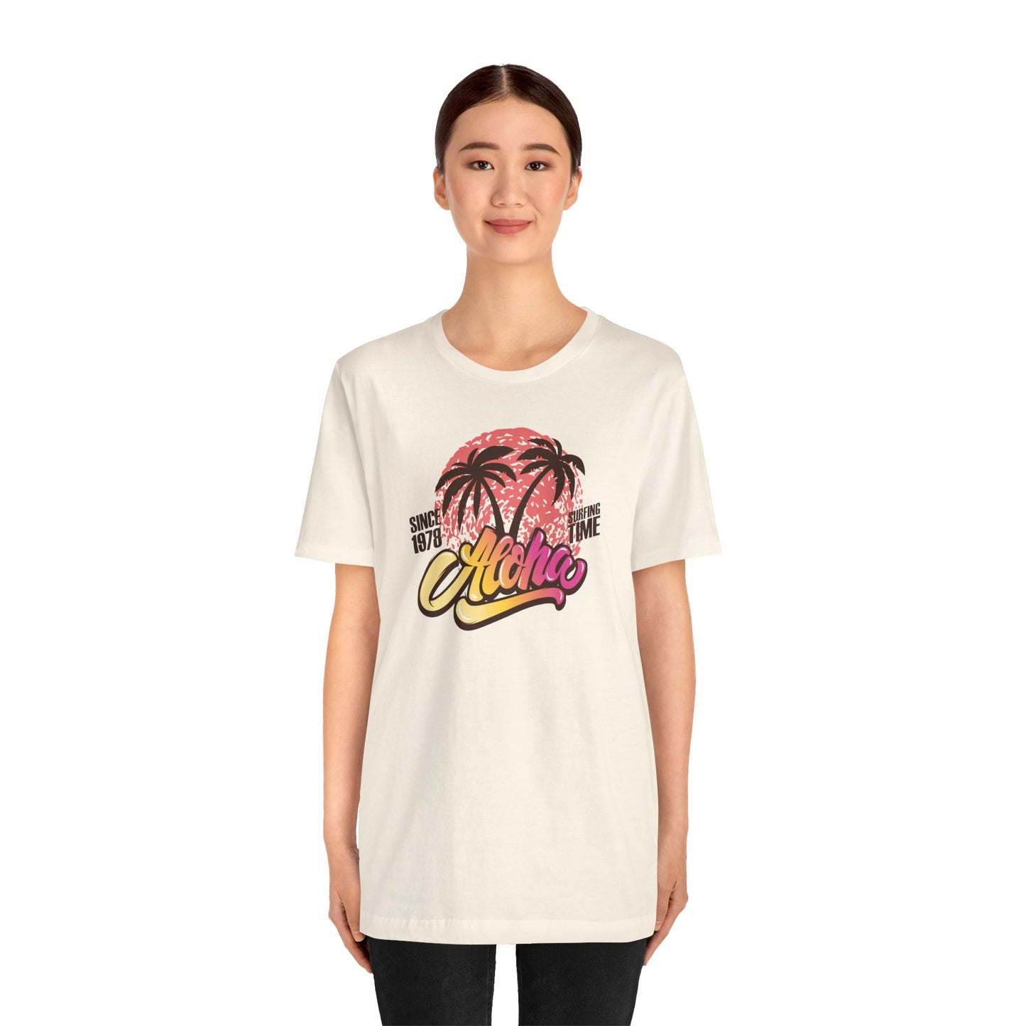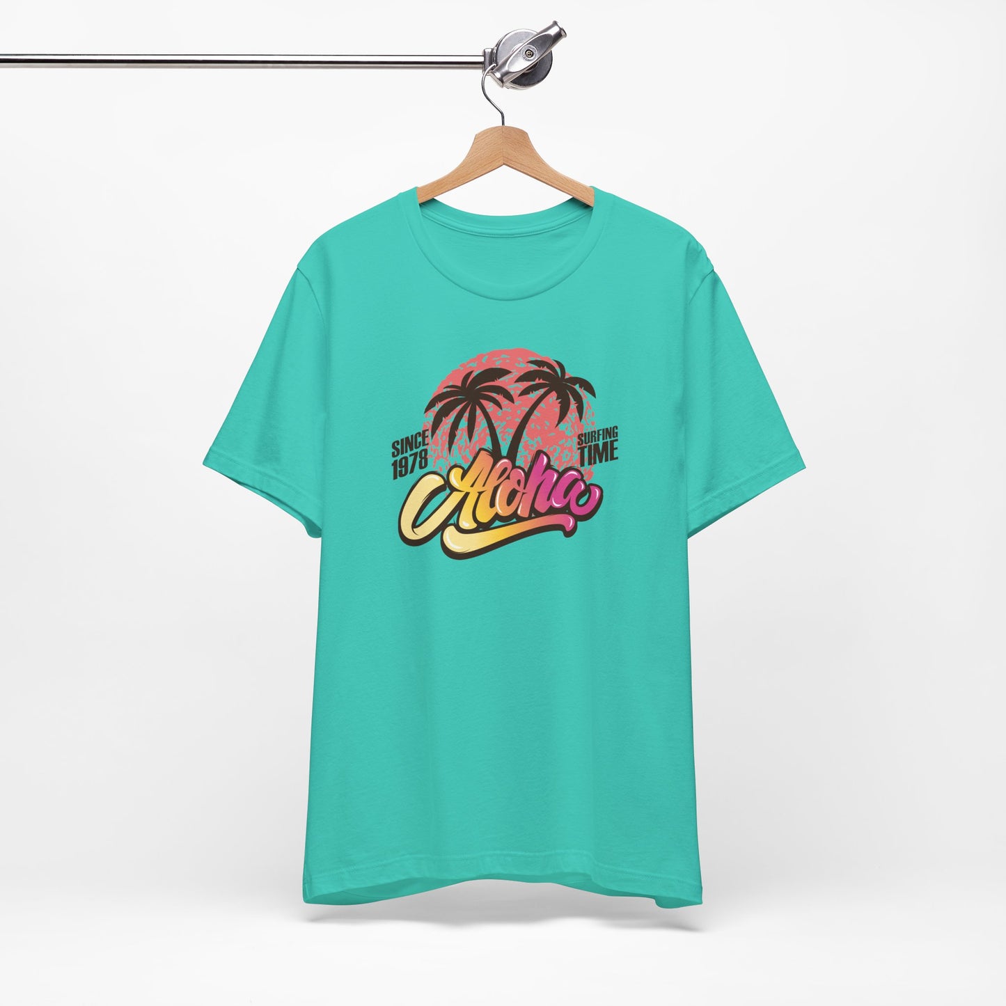 🌅🌴 Aloha — Vibrant Vibes! Celebrate timeless surf culture with this eye-catching design featuring "Aloha" in a funky font that transitions beautifully from golden orange to fuchsia, set over a bold coral red sun. The silhouette of two palm trees adds that perfect tropical touch, while the phrase "Since 1976 Surfing Time" pays tribute to classic beach vibes and endless summer adventures. Perfect for surf lovers and island dreamers ready to Express Yourself with color and style. Part of our Must-Have Merch collection at teeriffic.store, this design brings the spirit of surfing and sunshine wherever you go! 🌴🌞🌊✨