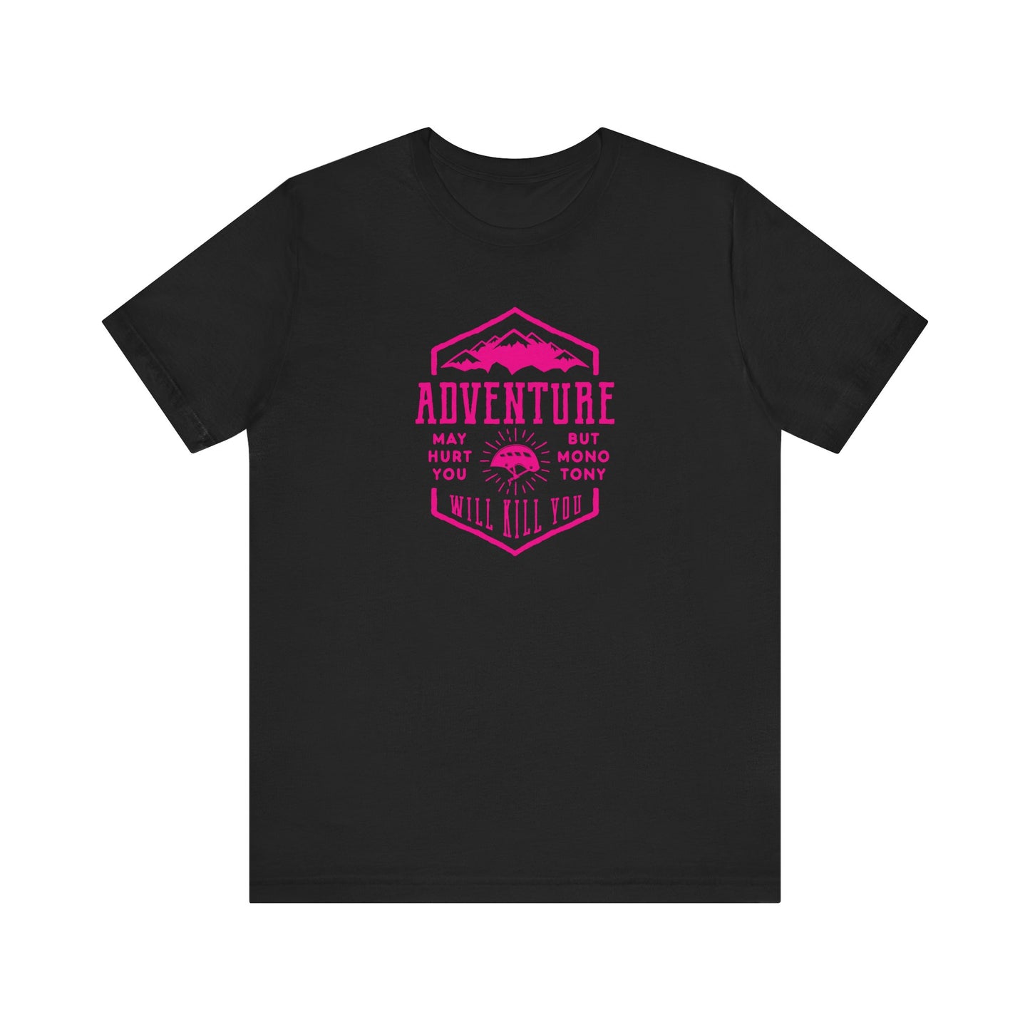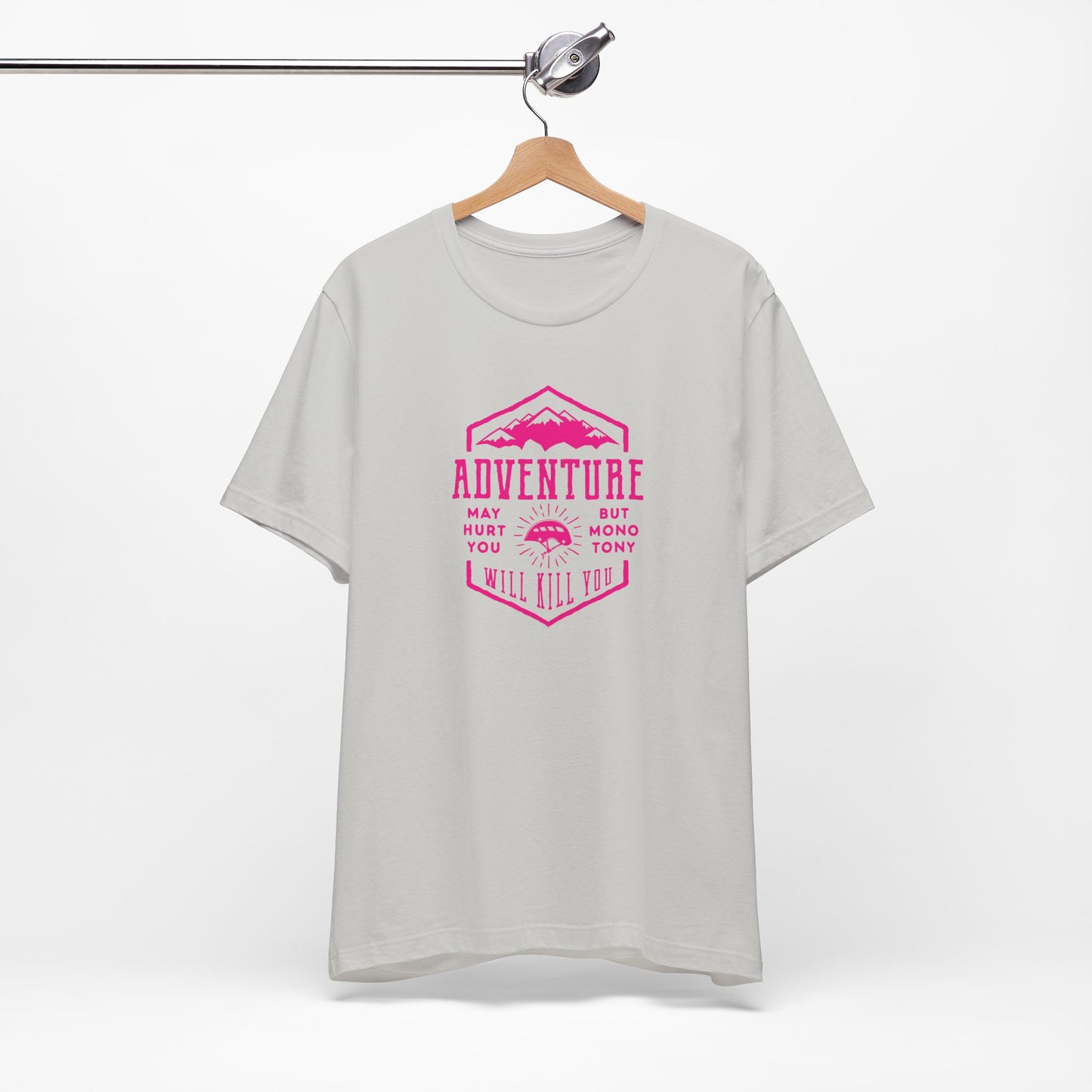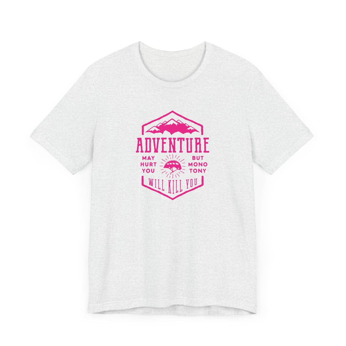 🏞️💥 Live Daringly! This bold design features the inspiring quote "Adventure May Hurt You But Monotony Will Kill You," perfect for those who believe in living life to the fullest and embracing the thrill of adventure. Perfect for anyone who appreciates motivational messages and bold aesthetics, this design combines courage with a touch of wisdom. Whether you're looking to decorate your space, wear it on a t-shirt, or gift it to someone special, this design is sure to bring a smile and celebrate the joy of taking risks and exploring new horizons. Grab yours now and embark on your next adventure! ✨🎉