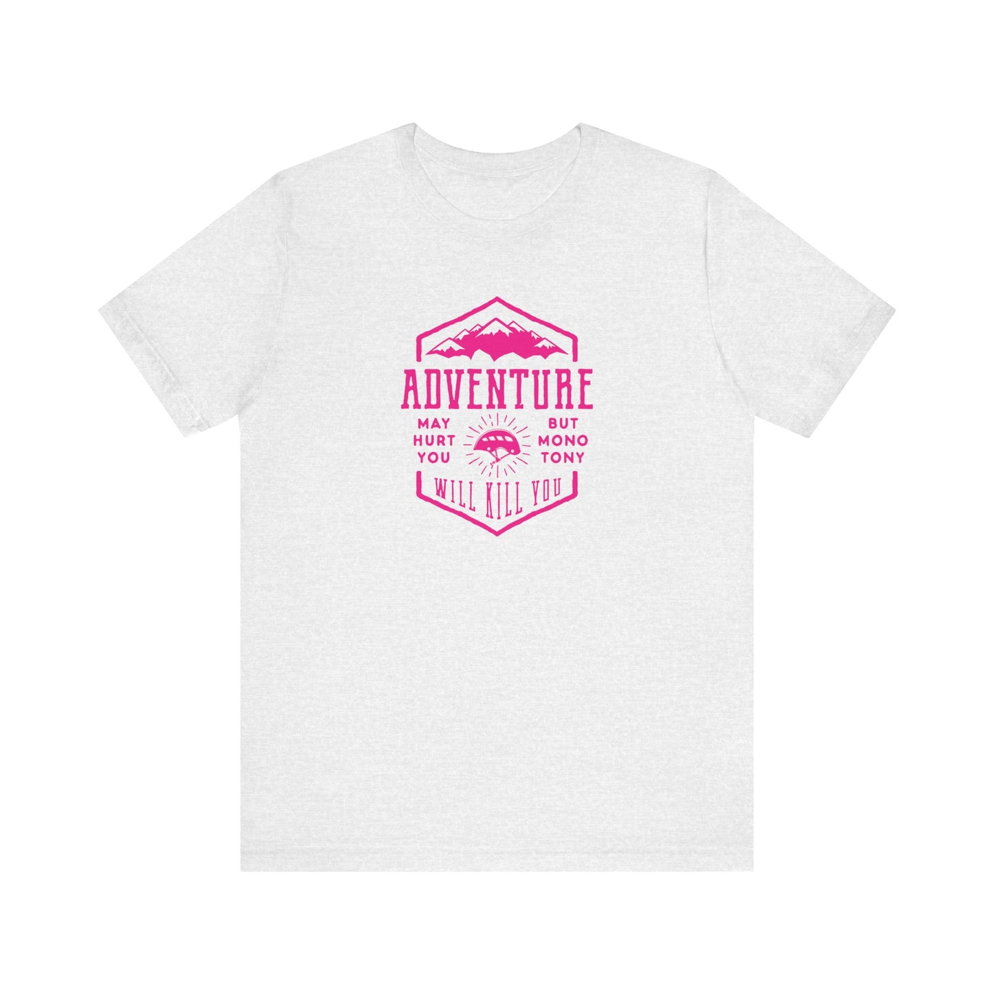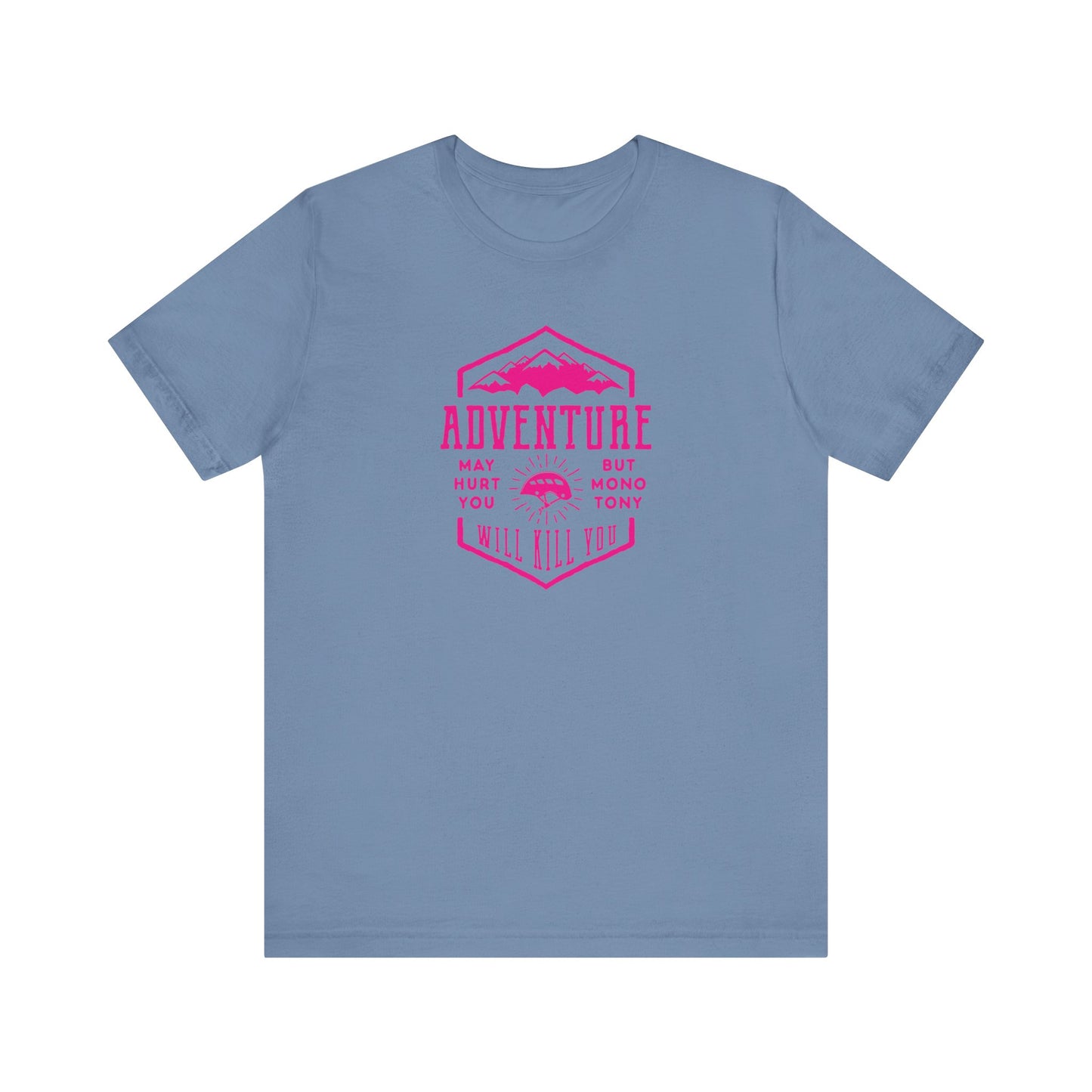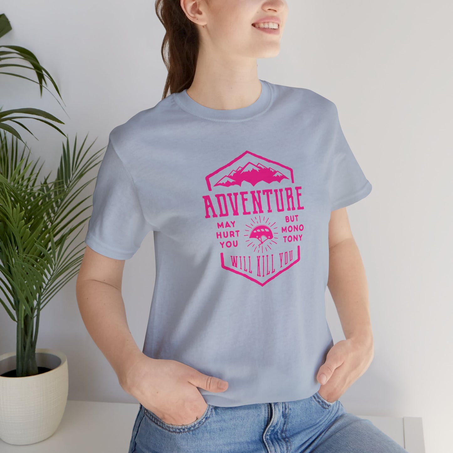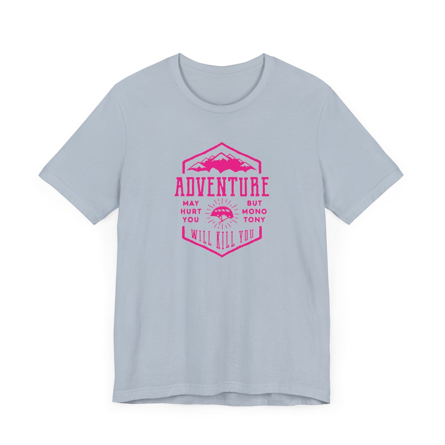 🏞️💥 Live Daringly! This bold design features the inspiring quote "Adventure May Hurt You But Monotony Will Kill You," perfect for those who believe in living life to the fullest and embracing the thrill of adventure. Perfect for anyone who appreciates motivational messages and bold aesthetics, this design combines courage with a touch of wisdom. Whether you're looking to decorate your space, wear it on a t-shirt, or gift it to someone special, this design is sure to bring a smile and celebrate the joy of taking risks and exploring new horizons. Grab yours now and embark on your next adventure! ✨🎉